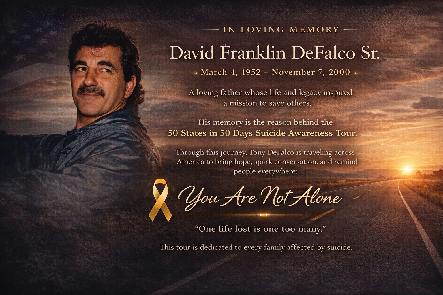 Hello! I’m Tony DeFalco. I’m driving across all 50 states in 50 days to raise awareness about suicide prevention in memory of my father, David Franklin DeFalco, Sr. whose life was cut short by suicide when I was younger. I believe that sharing my story can help remind others that they are not alone. When you support this mission, you are helping to bring light to those who are struggling, offering them a message of hope and showing that people care.
